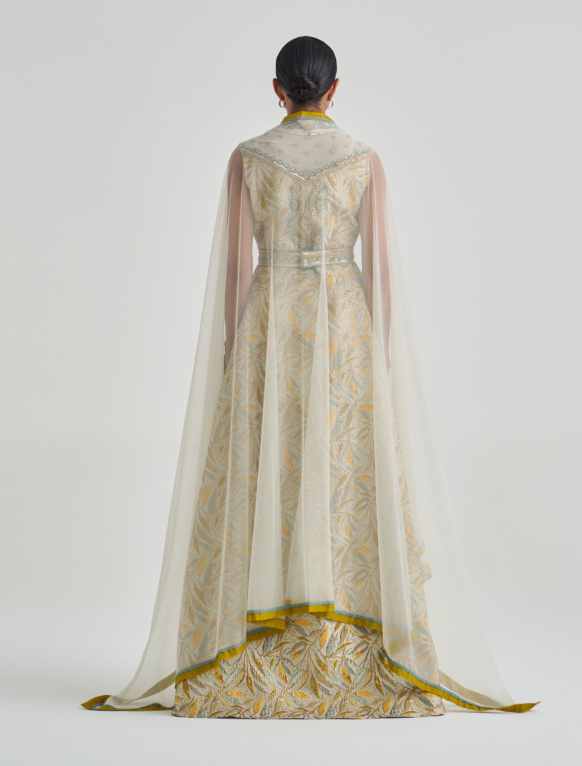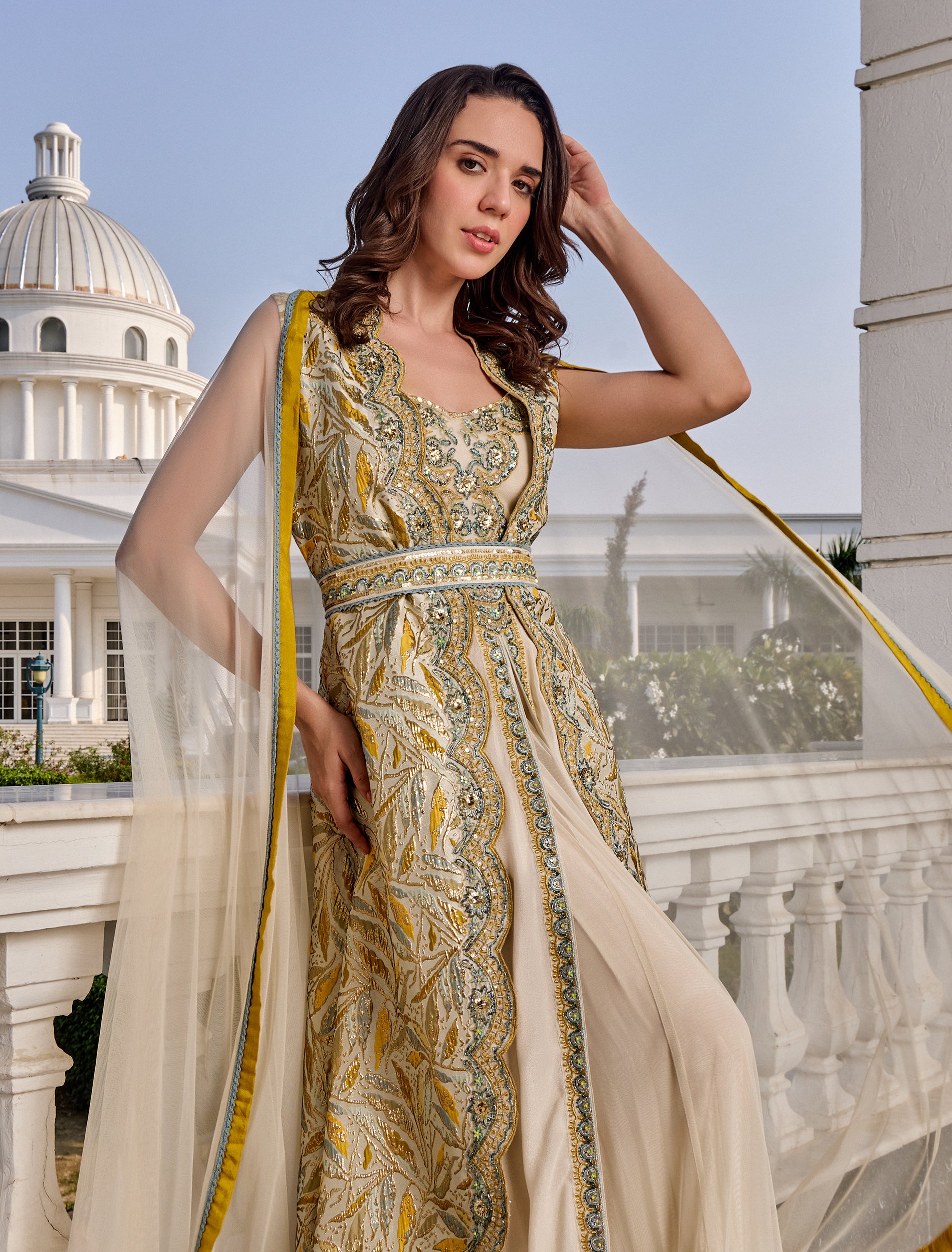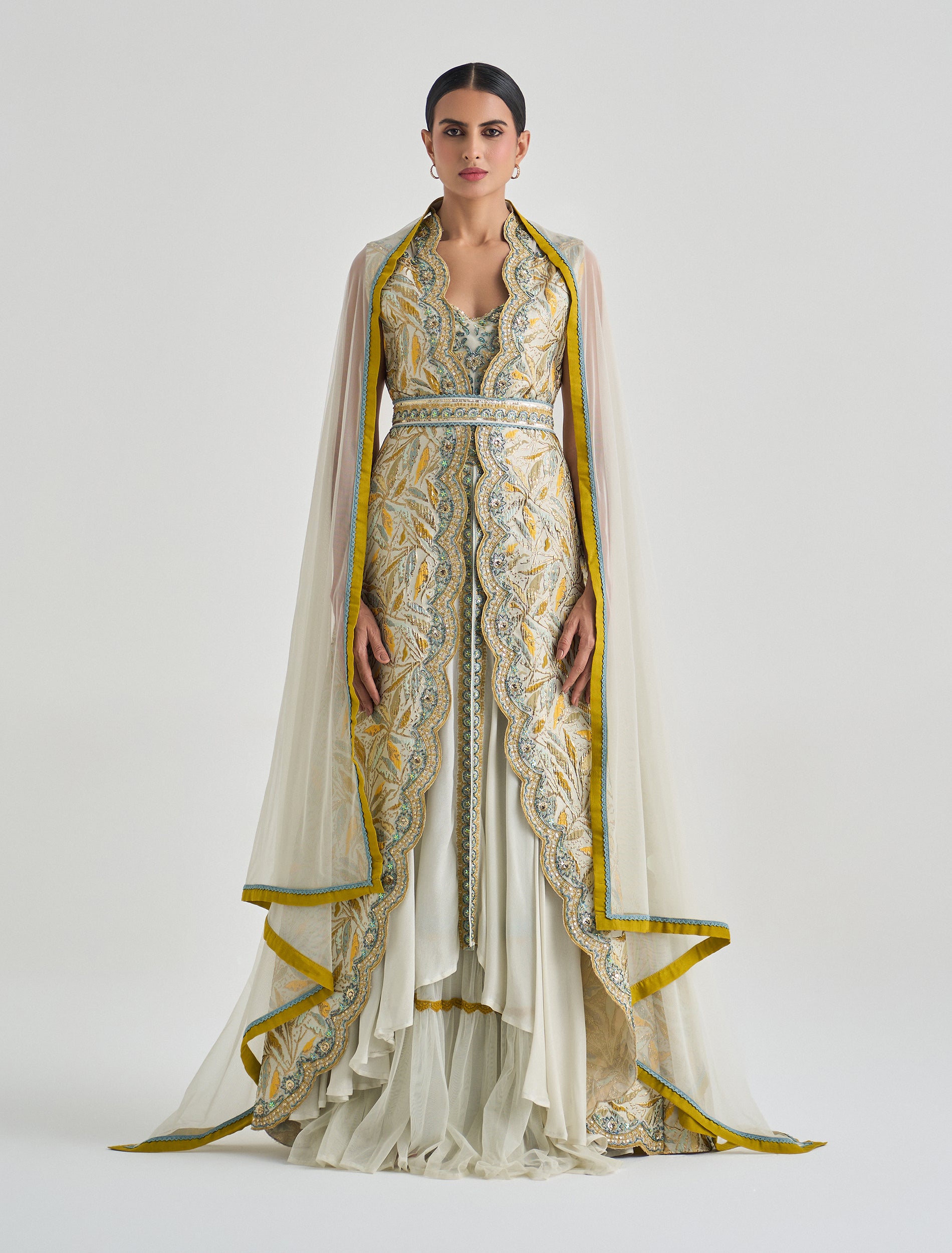 القصة: تصميم طبقات منسدلة مع فتحة أمامية مموّجة مطرزة بالكامل.