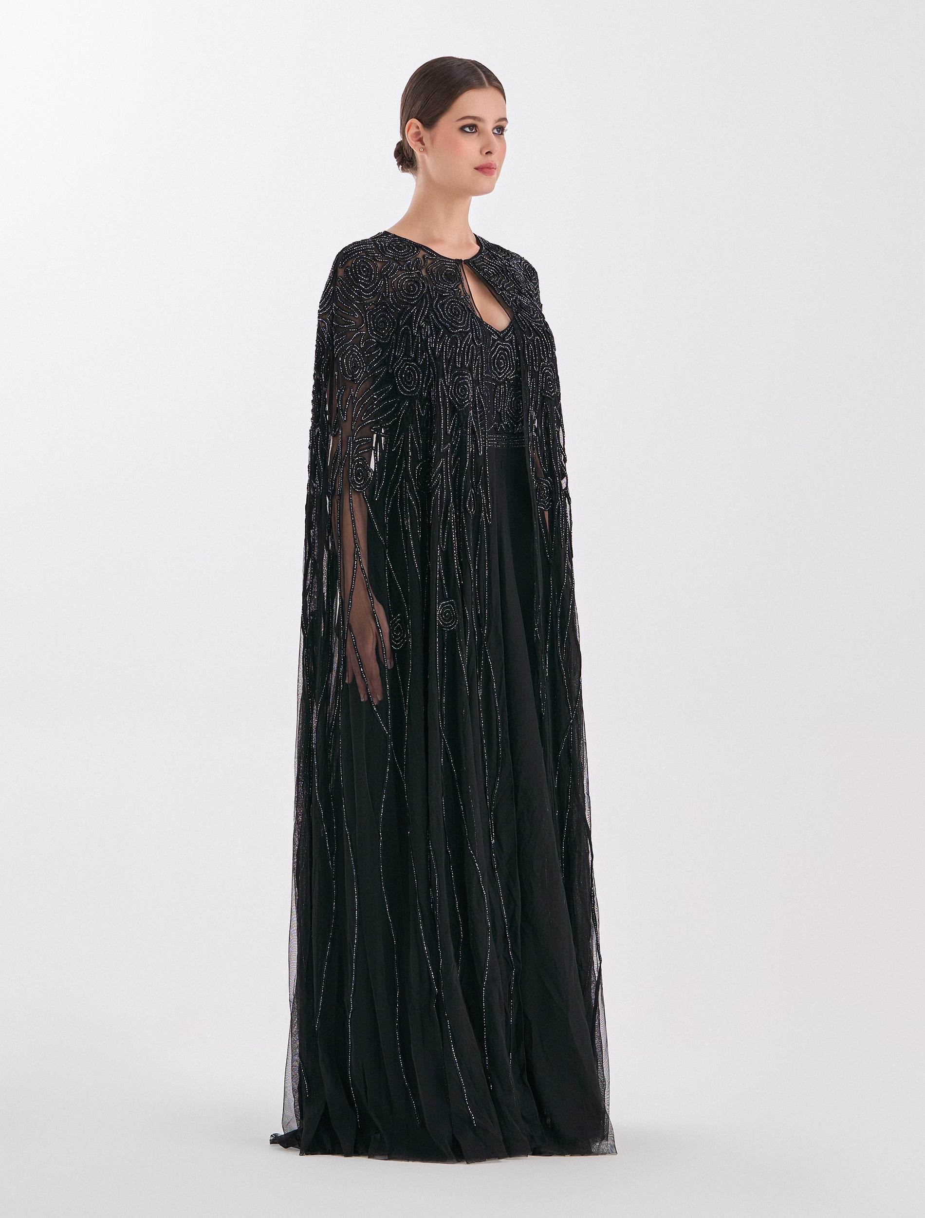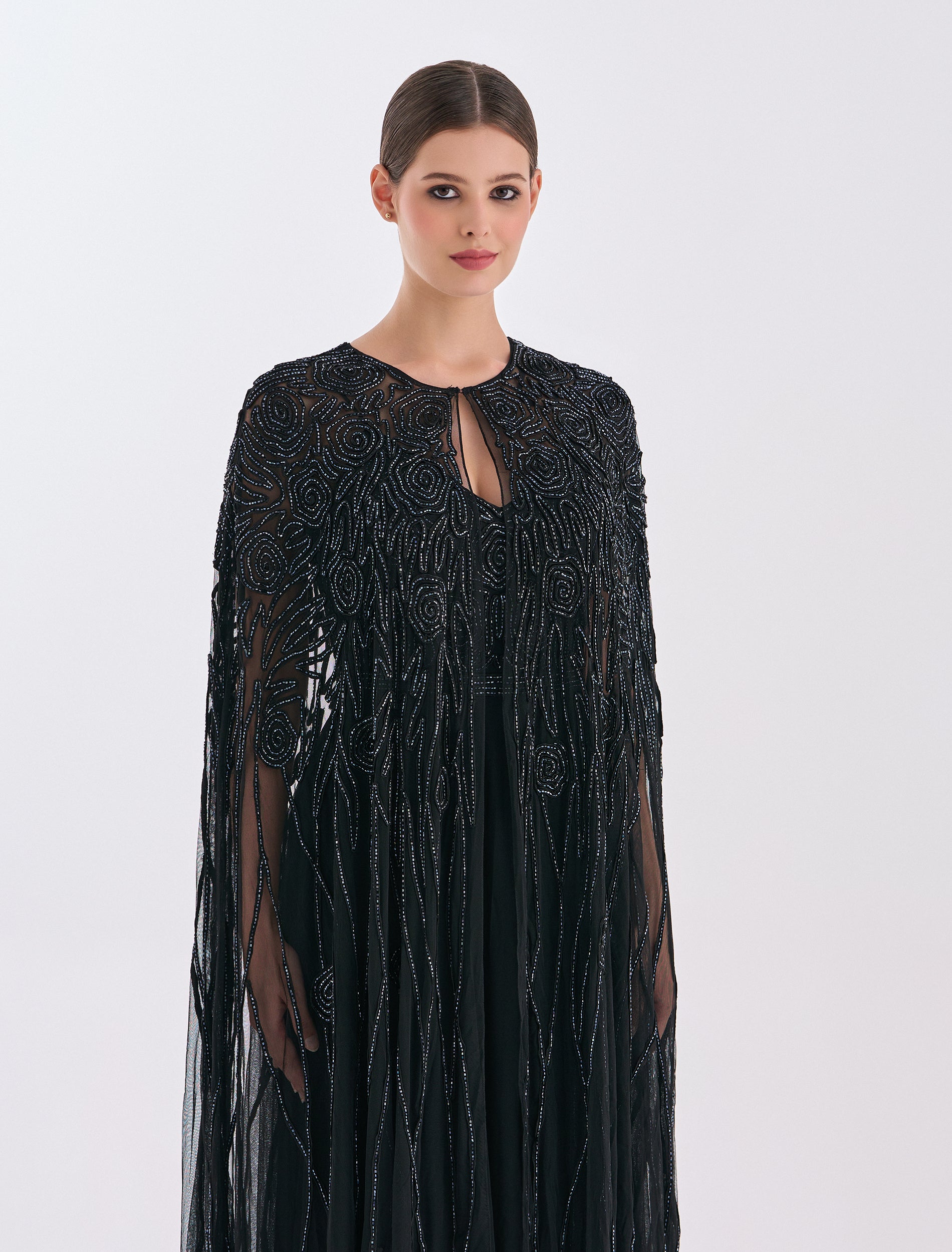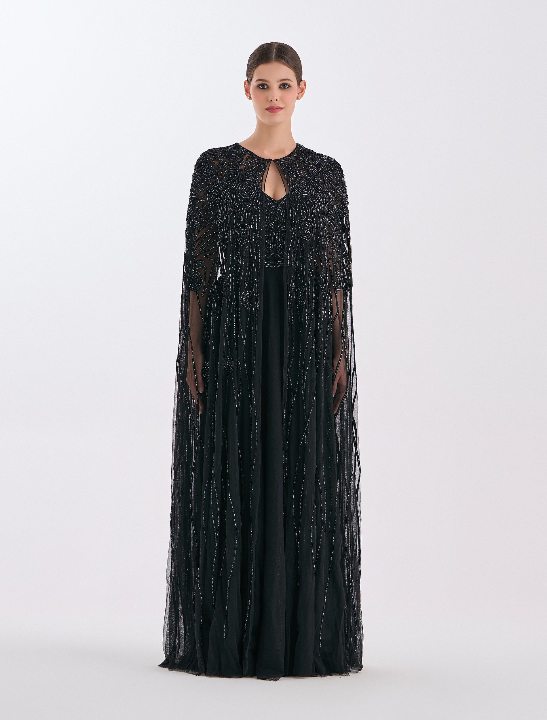 فستان سهرة أسود بأكمام مع كيب مطرز يدويا