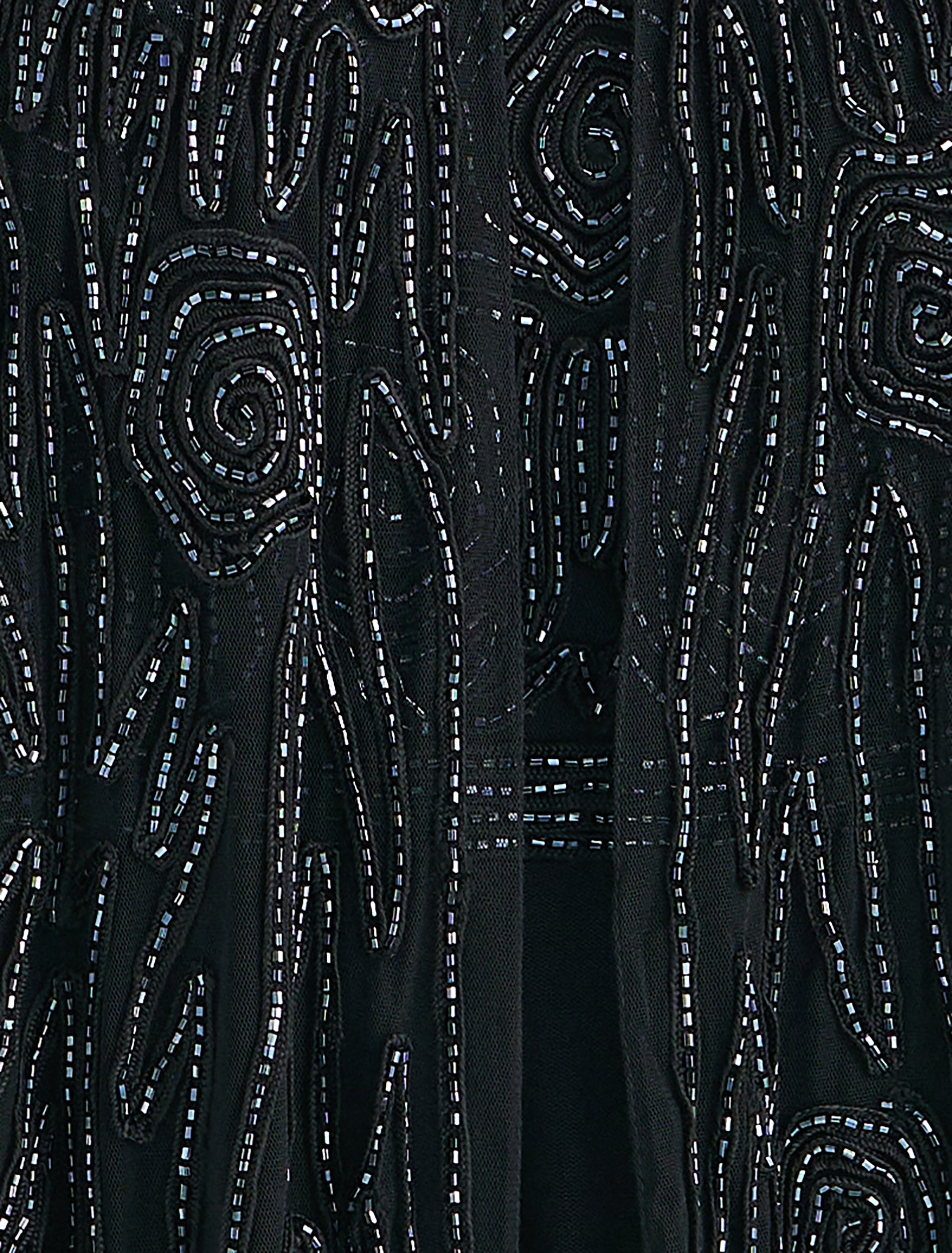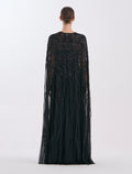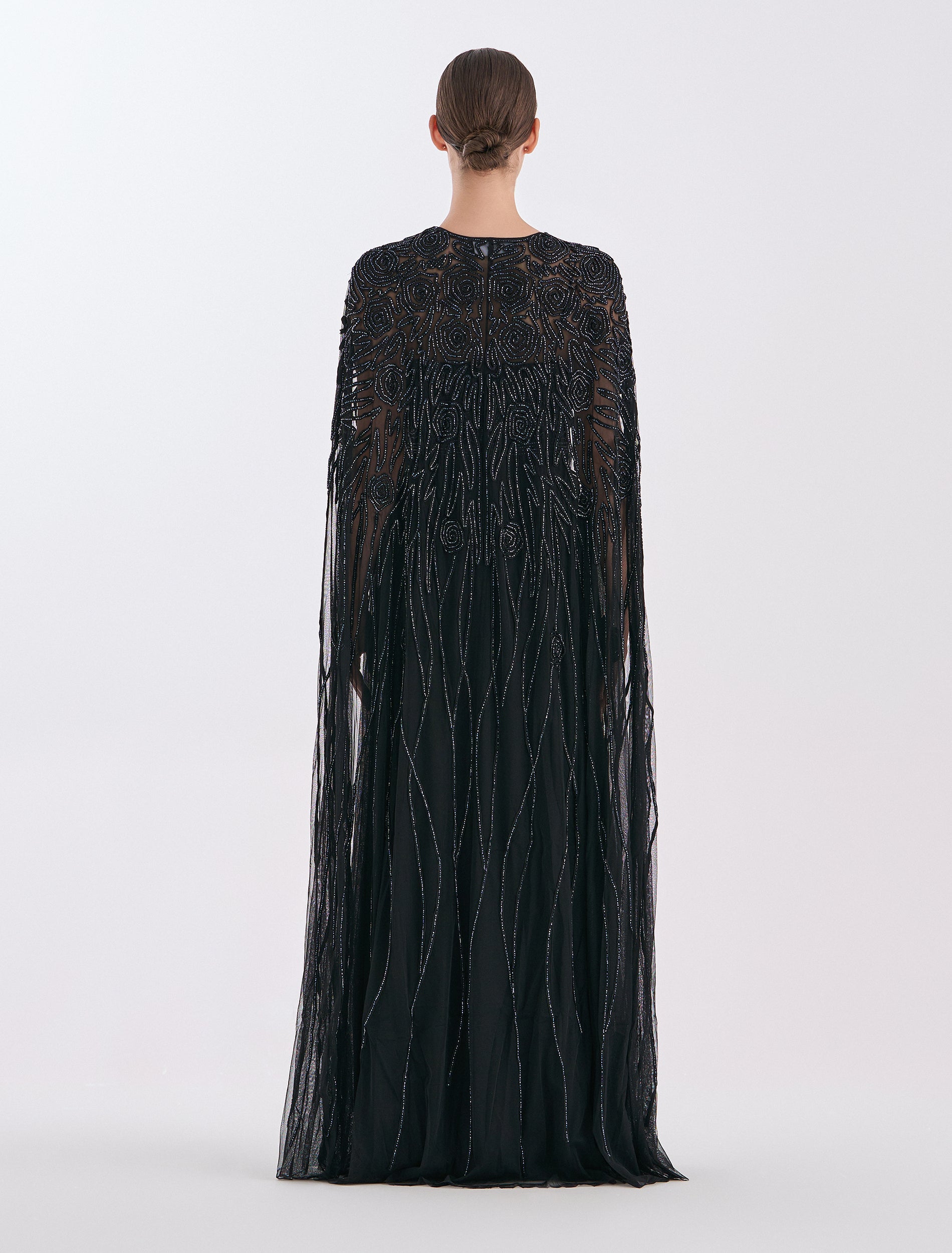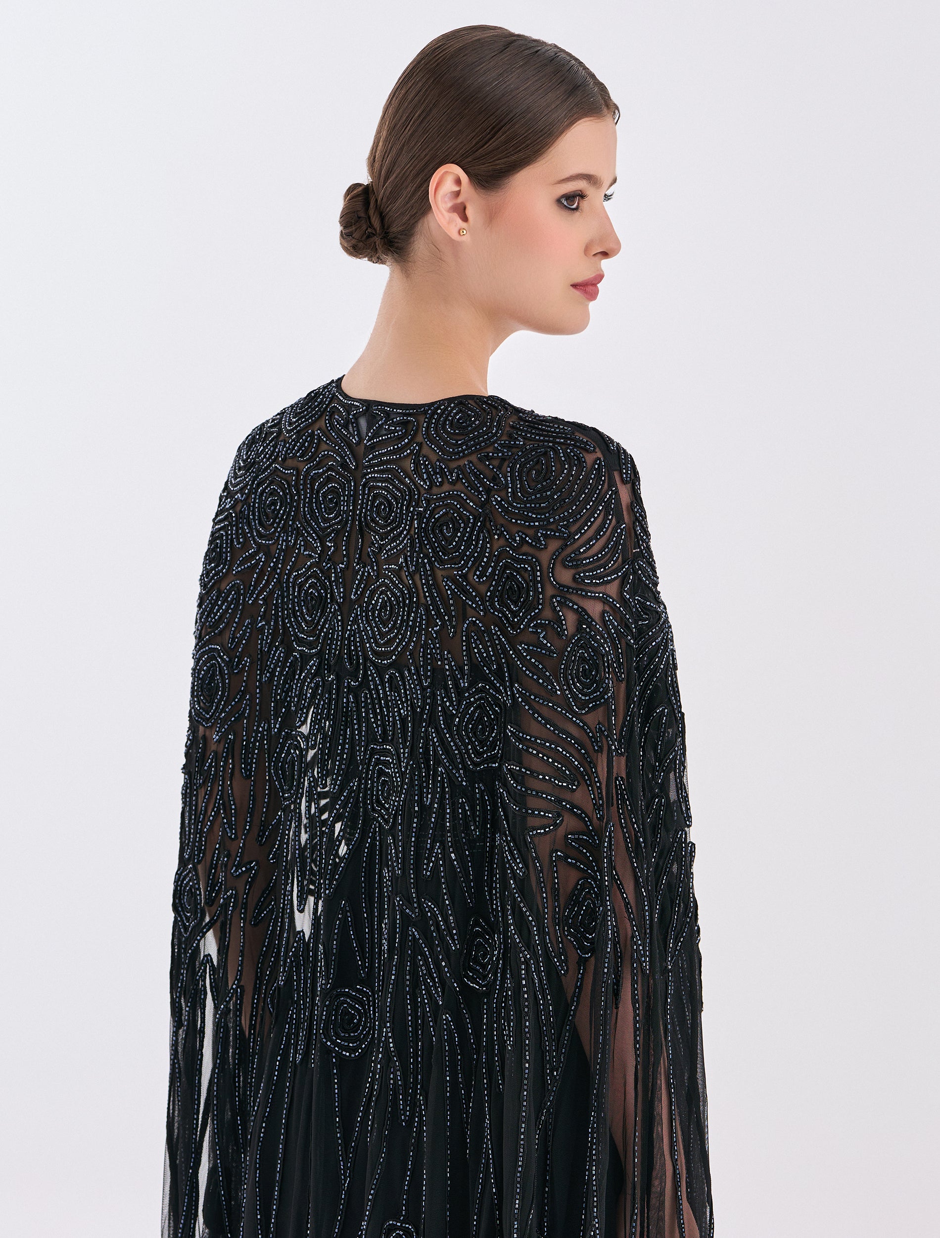 فستان سهرة أسود بأكمام مع كيب مطرز يدويا