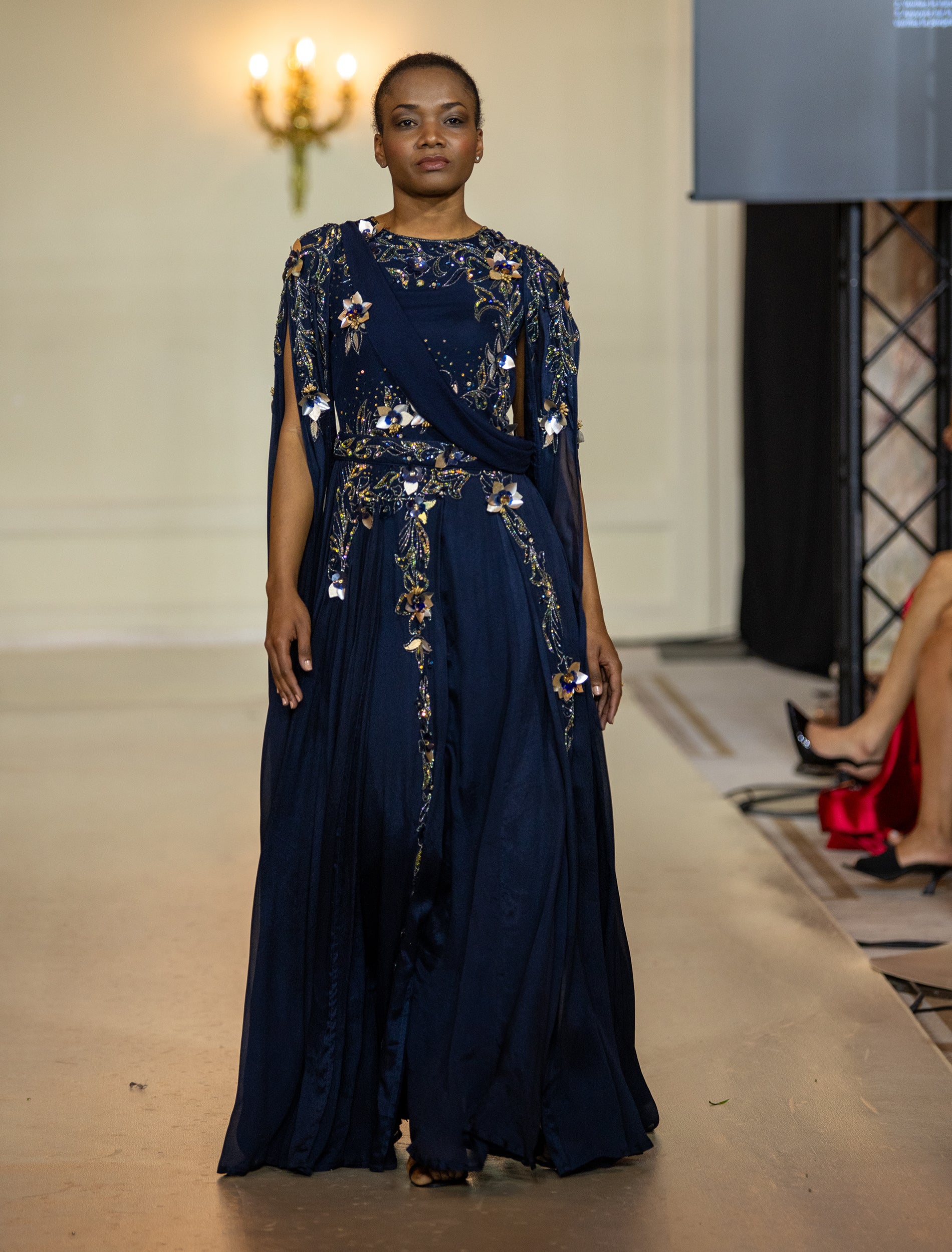 - نوع التطريز: فستان كحلي مطرز بتطريزات ورود متناثرة بشكل ثلاثي الأبعاد.