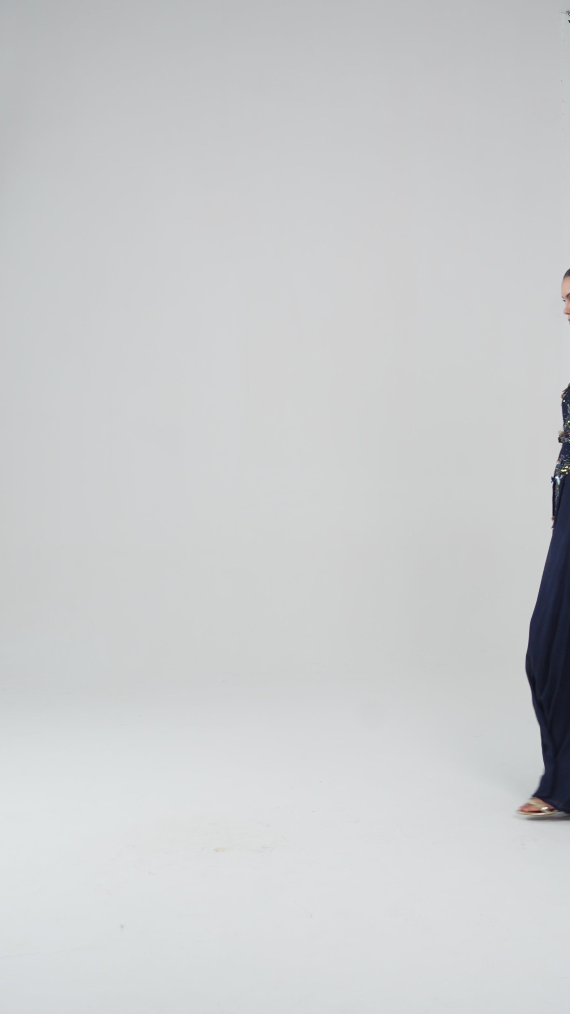 فستان سهرة لون كحلي طويل من شالكي مطرز بالورود يمنحك إطلالة ملكية متكاملة. يتميز الفستان بأنه فستان ناعم طويل بطول 60 إنش مع تصميم انسيابي أنيق. يأتي فستان كحلي مطرز بتطريز يدوي فاخر على شكل ورود ثلاثية الأبعاد ملونة بالذهبي والأبيض والبنفسجي. فيما تأتي الرقبة بشكل دائري مغلق مع تطريزات ناعمة، أما الأكمام فتأتي على شكل الكاب المفتوح والذي ينسدل إلى الأرض مما يجعله مناسبًا للسهرات وحفلات الزفاف والخطوبة.