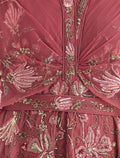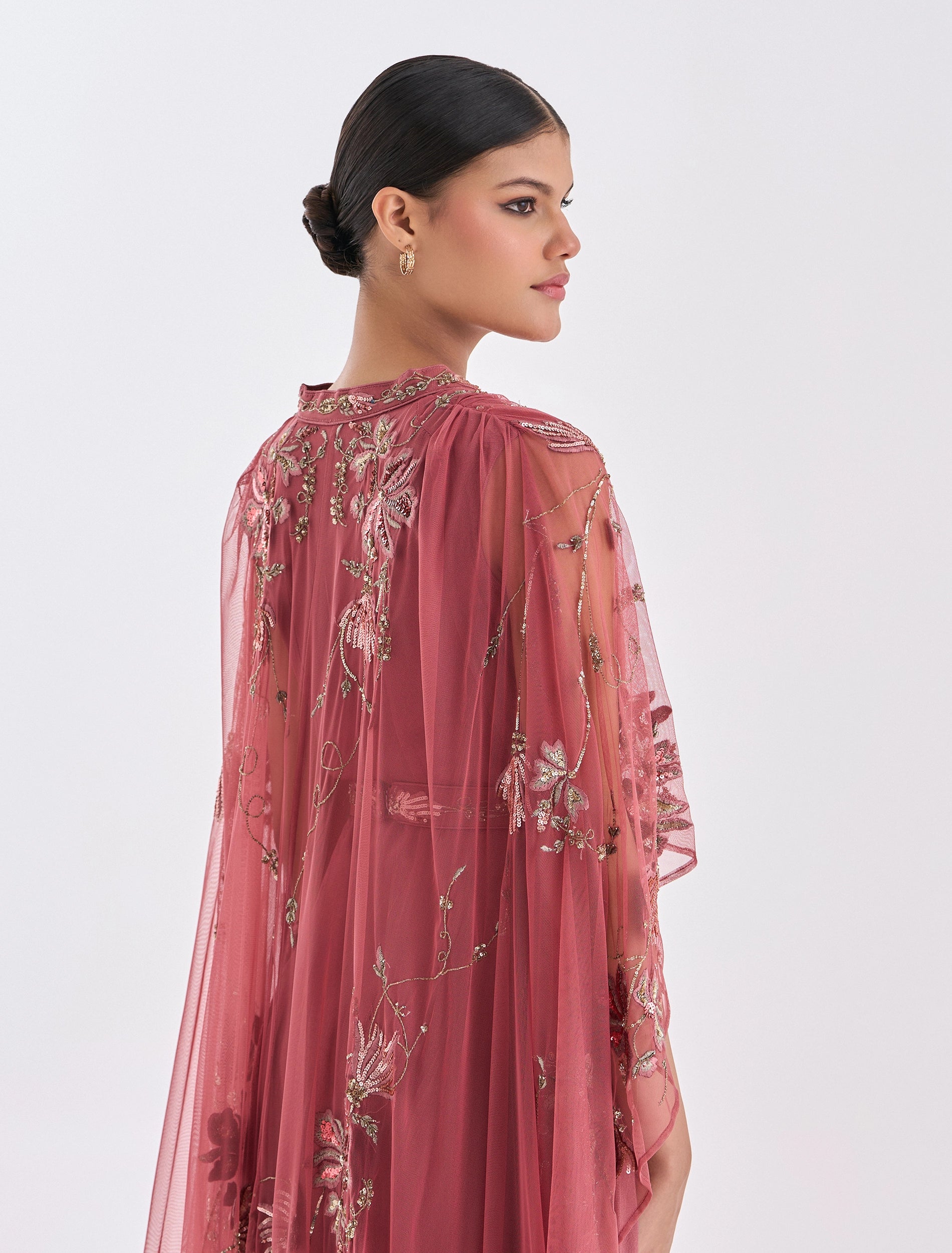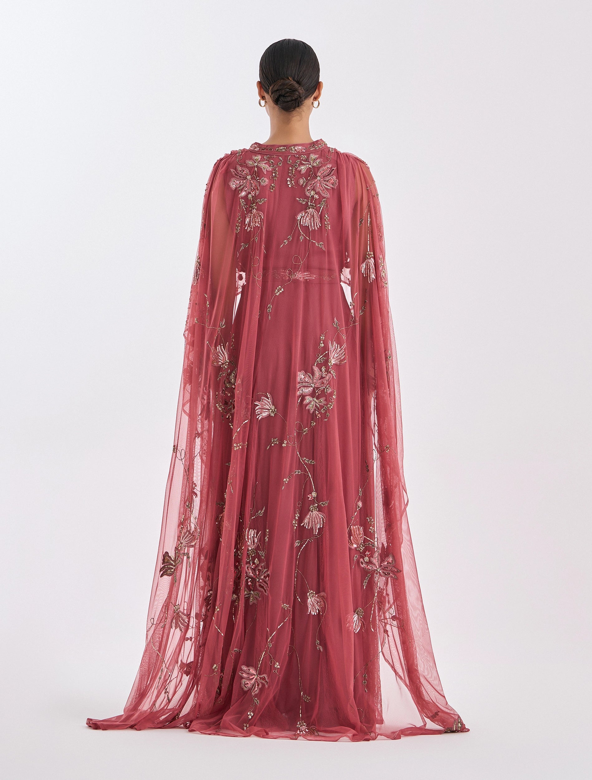 انعمي بفستان وردي ناعم فاخر للسهرات مع كيب طويل يضيف لمسة من الفخامة والتفرد. موديل فستان مطرز مزين بتطريز يدوي دقيق يظهر الزهور والأنماط الراقية.