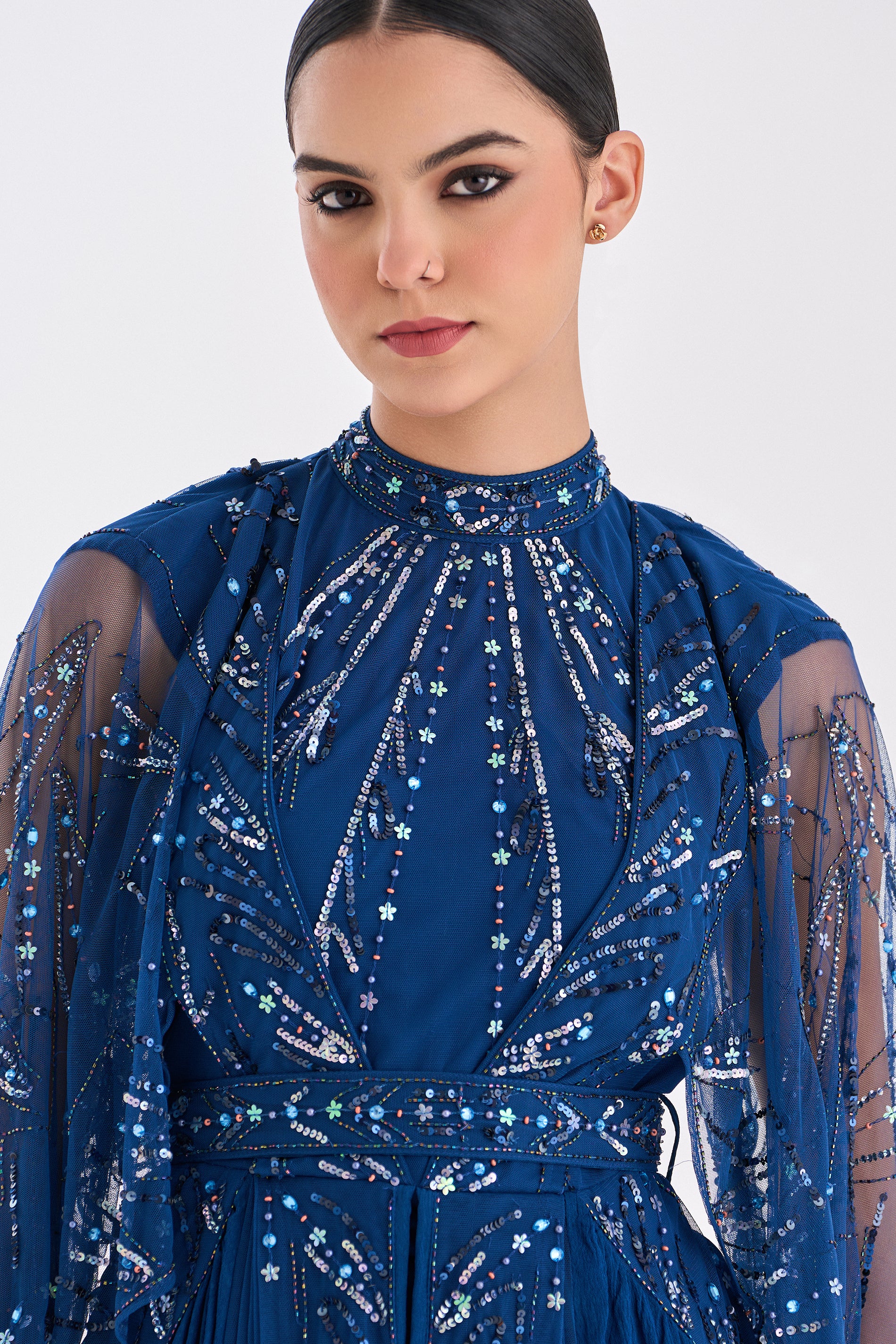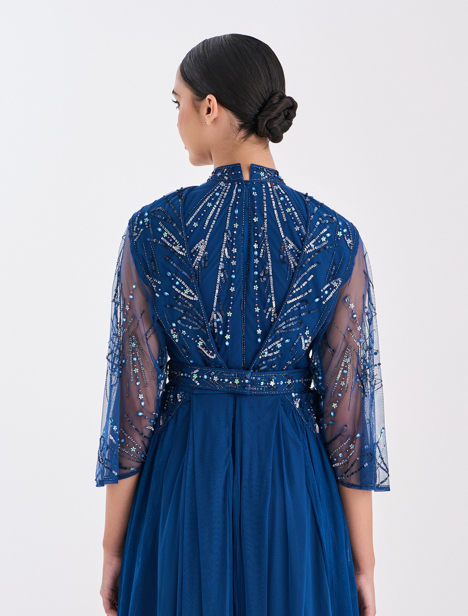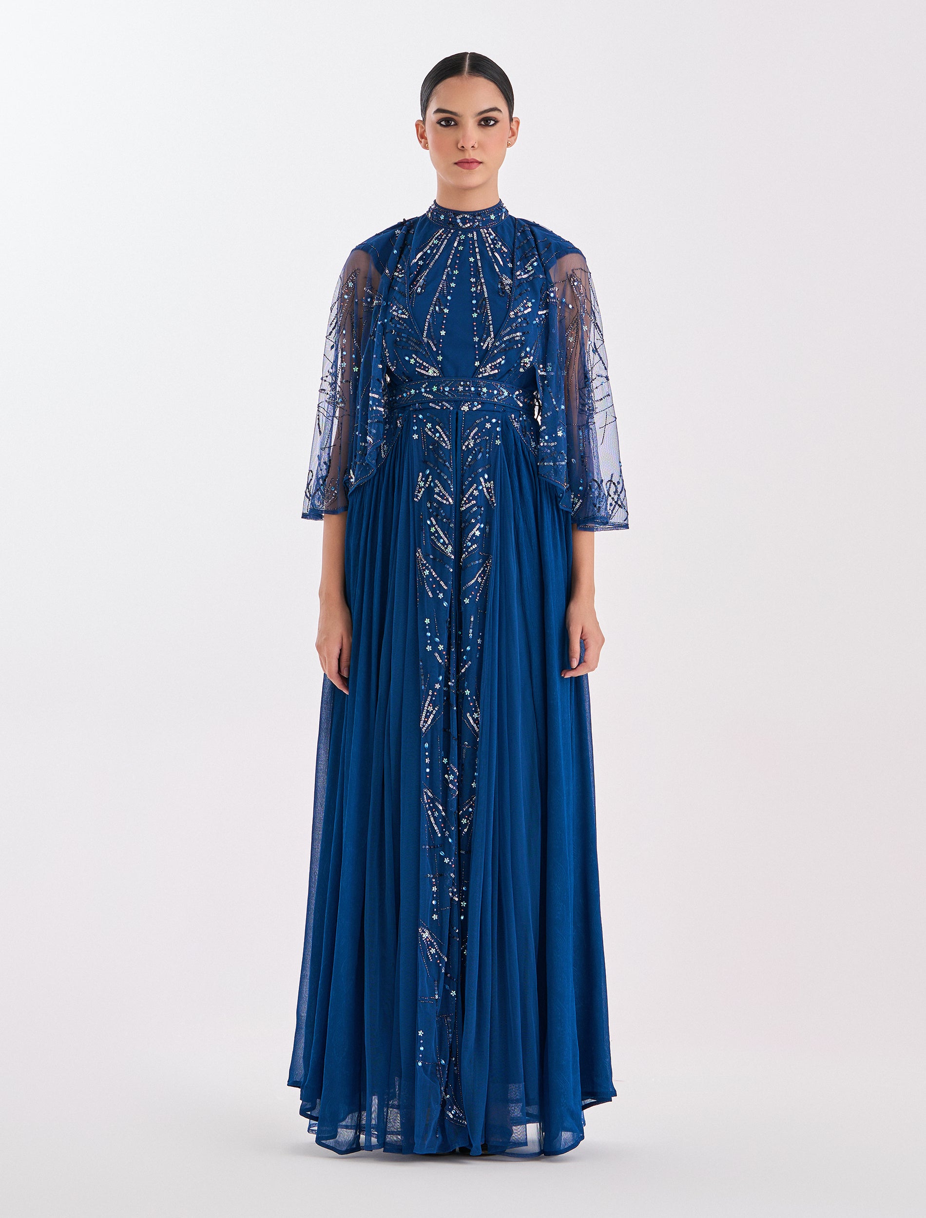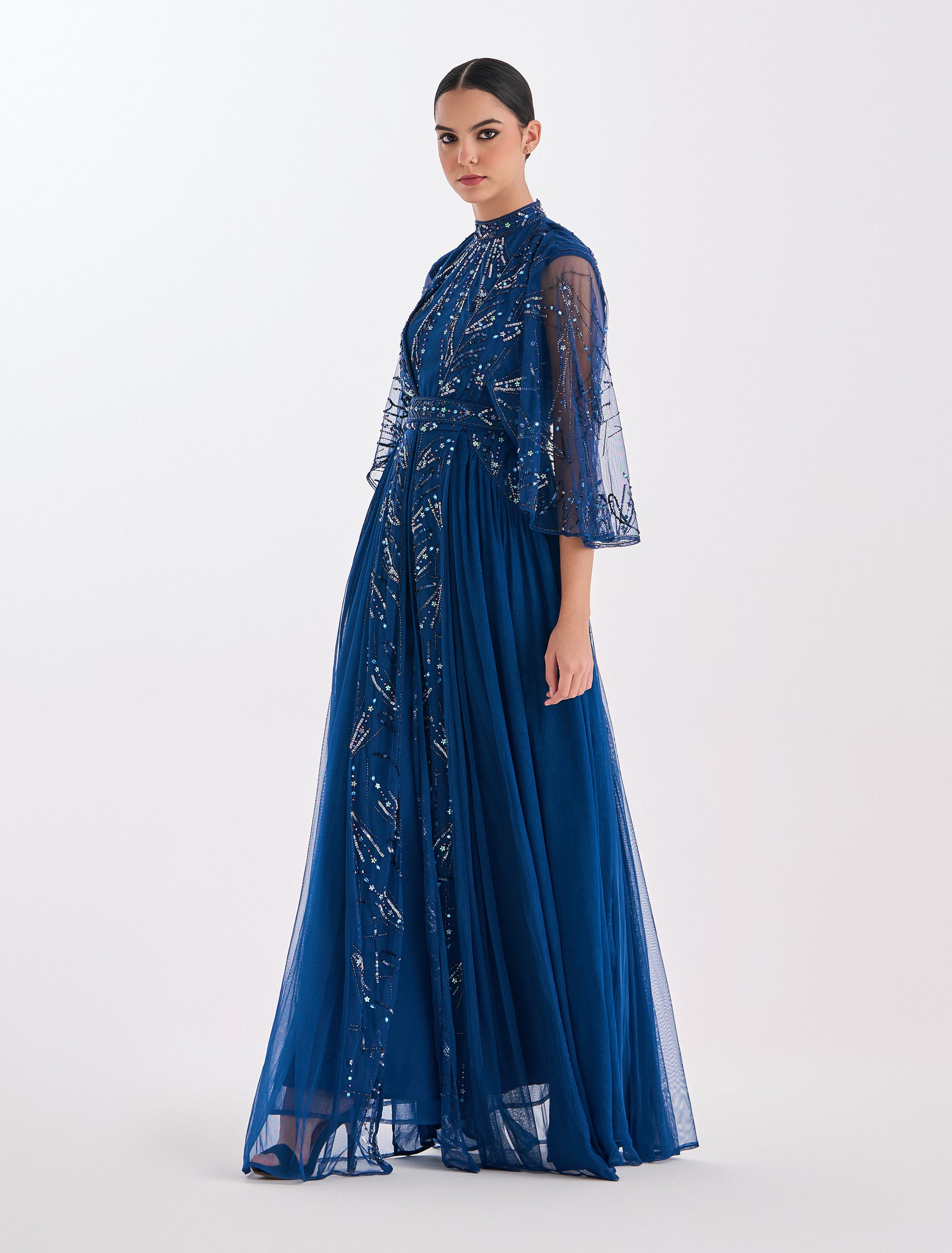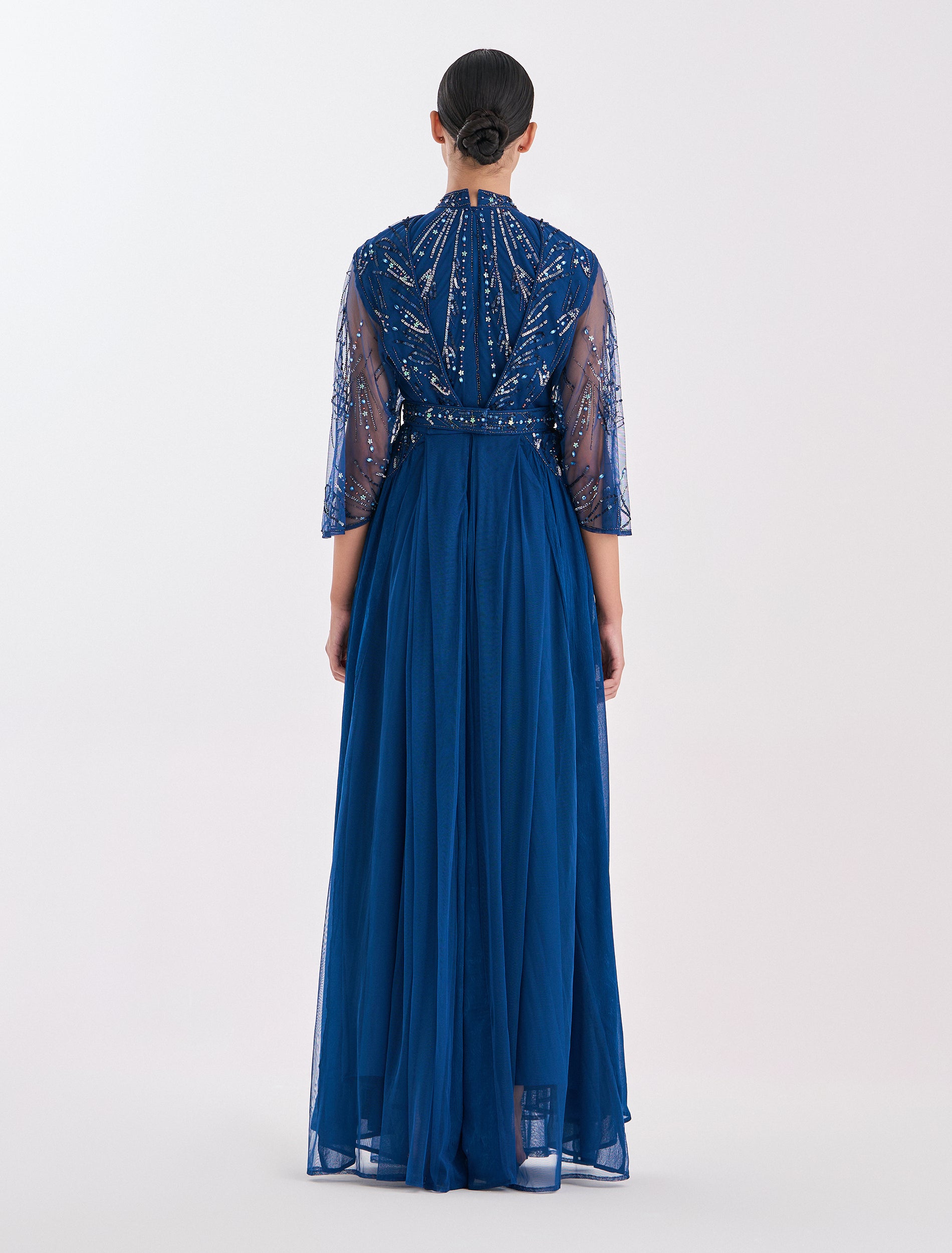 فستان سهرة مطرز يدويا مع أكمام من التل