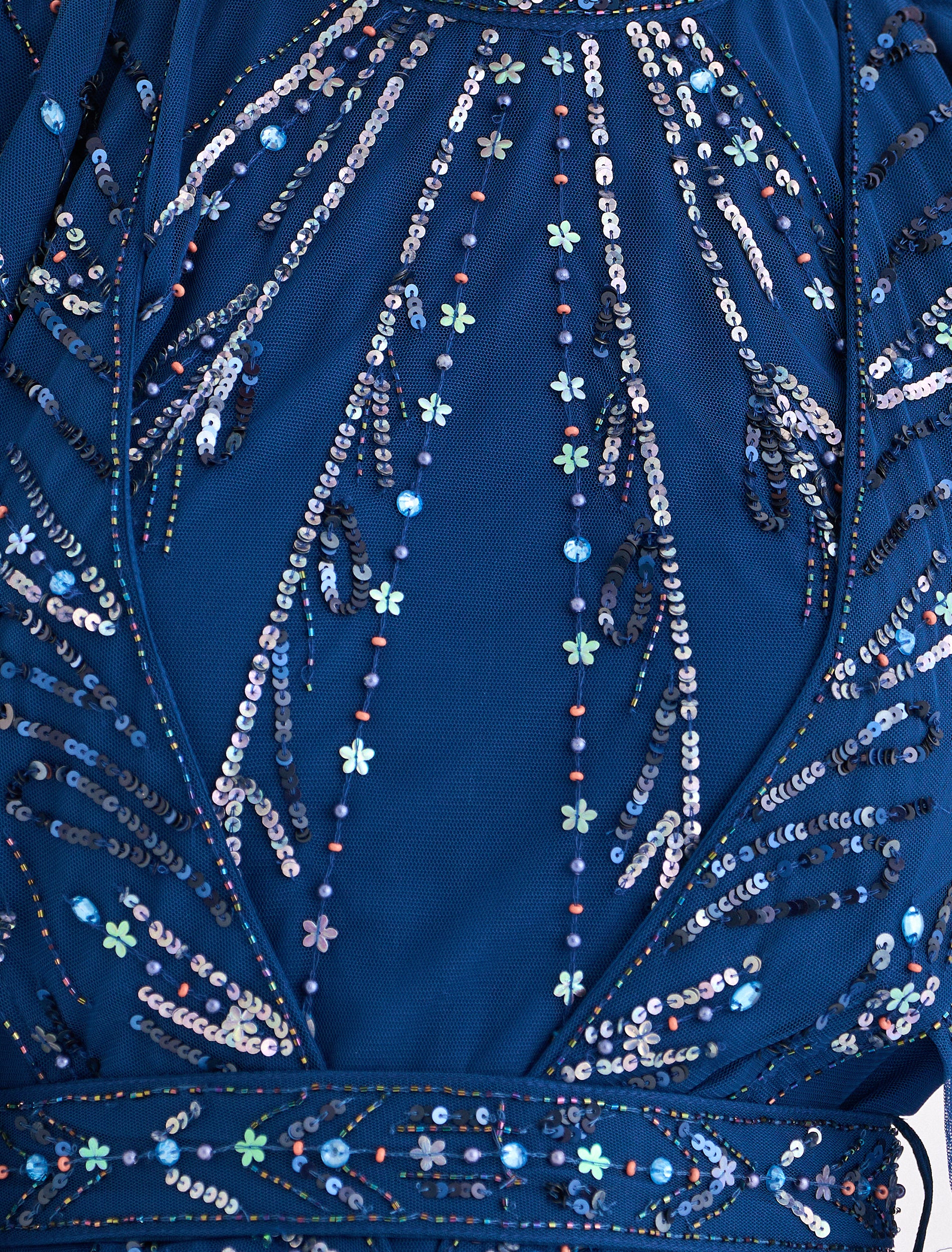 تطريز مميز من الأمام مع رقبة دائرية، مصمم للحفلات والمناسبات.