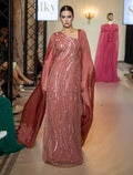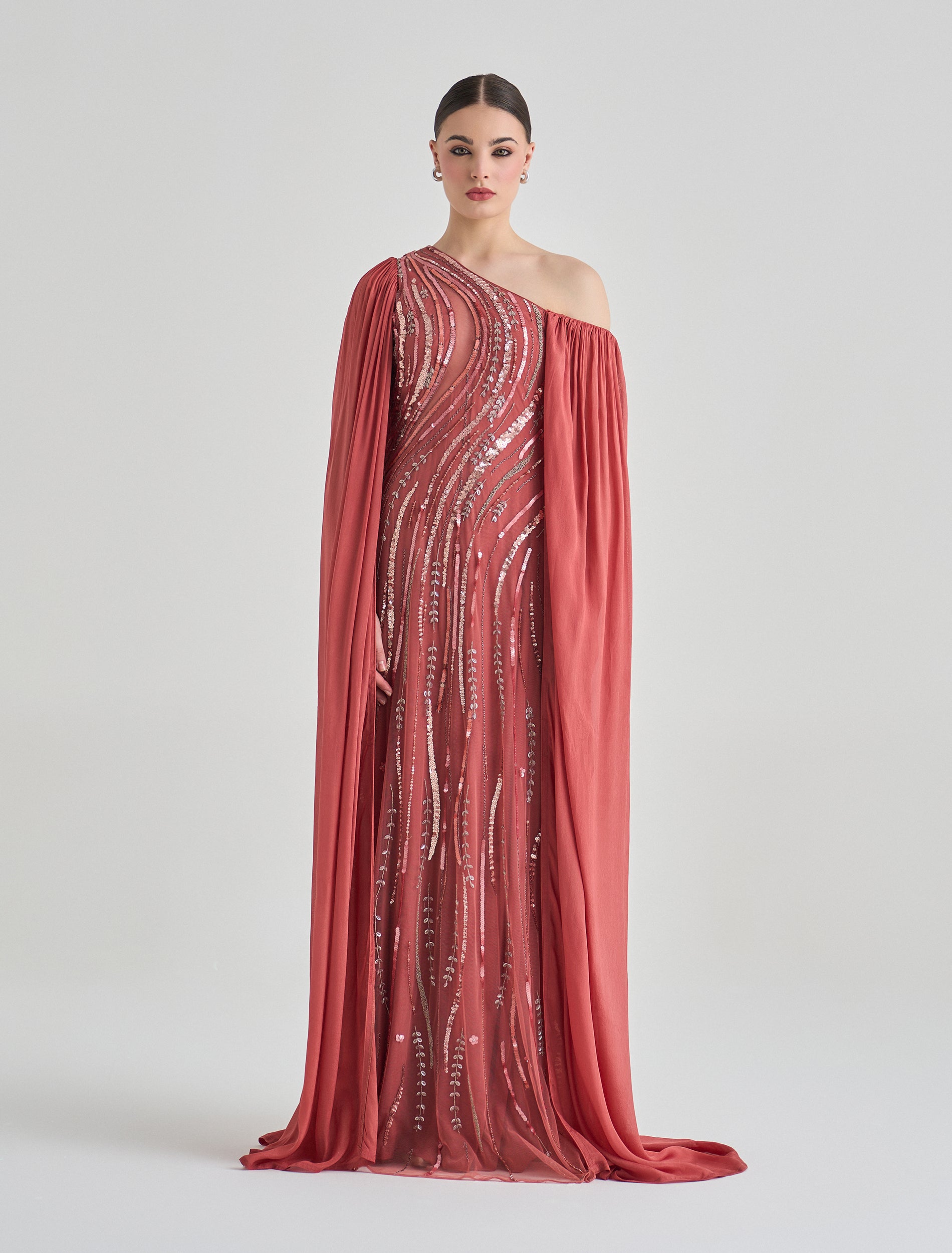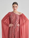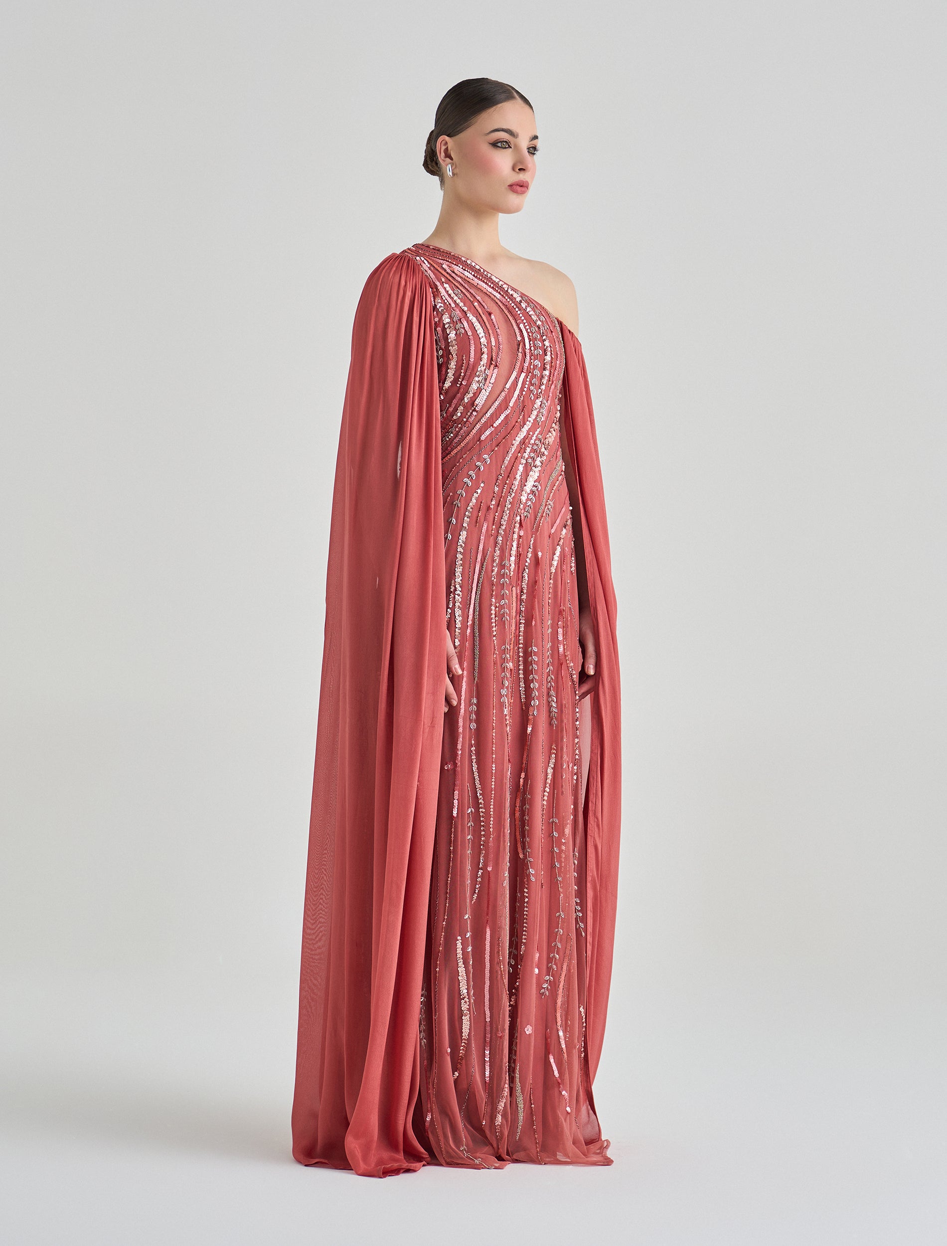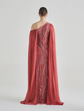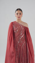 فستان طويل بكتف واحد مطرّز بالترتر